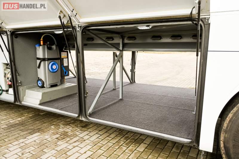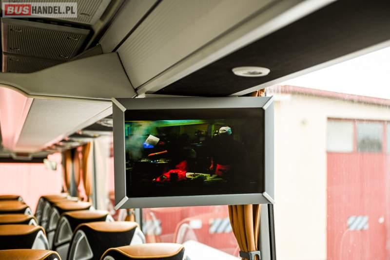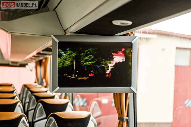 Wyposażenie: klimatyzacja, WC, lodówka, caffebar, kabina sypialna, oświetlenie indywidualne, nawiewy dyszowe, podnóżki, stoliczki, siateczki, ABS, ASR, tempomat, retarder, telefon, nawigacja, CD, mikrofon, radio, fotele odchylane i rozsuwane, kuchenka mikrofalowa, wyświetlacz matrix, sejf, regulacja wysokości nadwozia, centralny zamek, podwójne szyby boczne, wspomaganie kierownicy, elektryczne lusterka, ogrzewanie stacjonarne, DVD, hak holowniczy, ESP