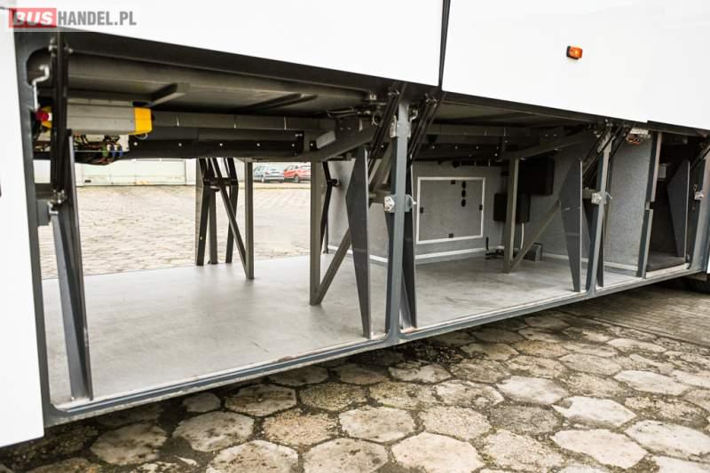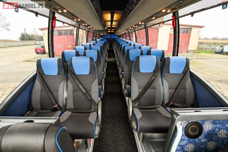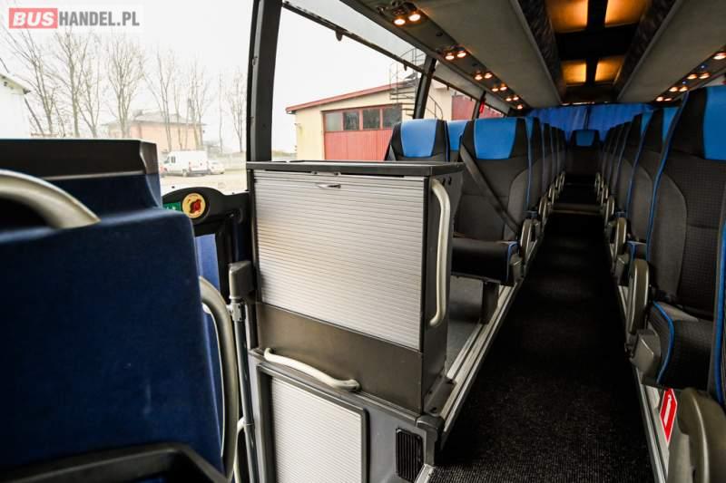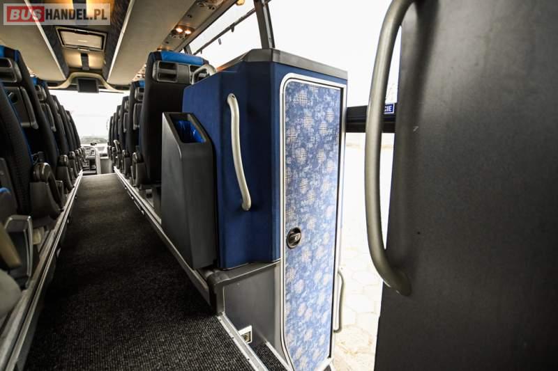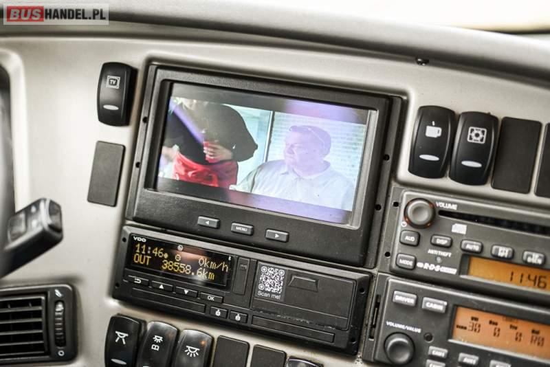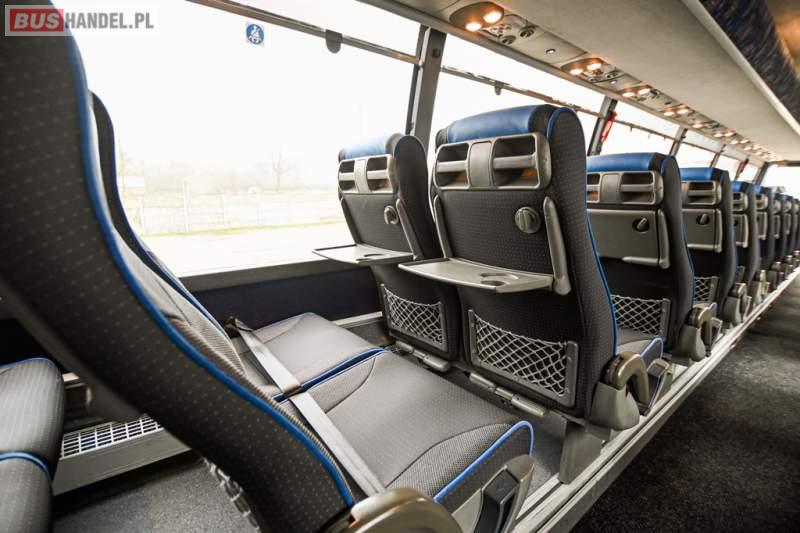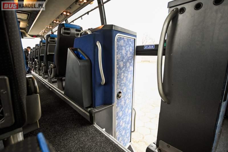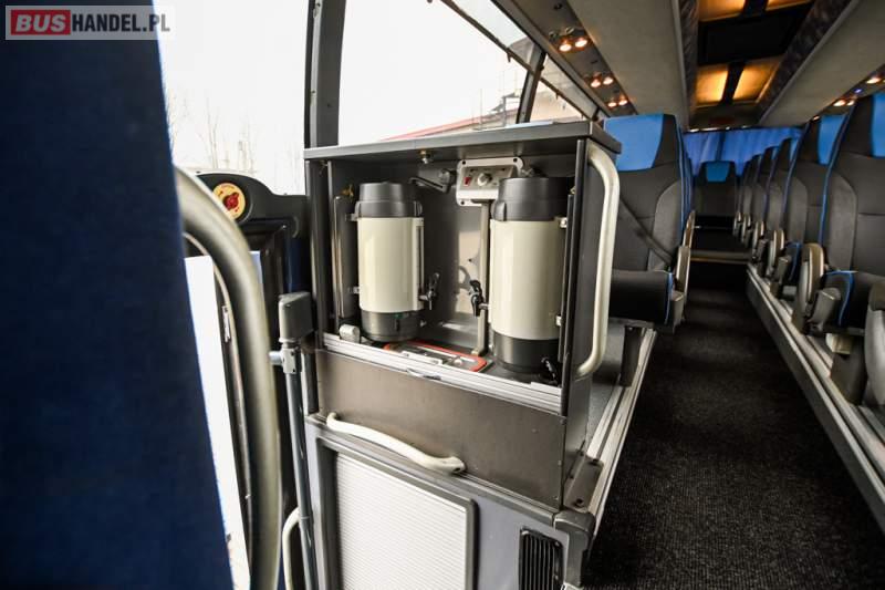 Wyposażenie: klimatyzacja, WC, lodówka, caffebar, kabina sypialna, oświetlenie indywidualne, nawiewy dyszowe, podnóżki, stoliczki, siateczki, ABS, ASR, tempomat, retarder, telefon, CD, mikrofon, radio, fotele odchylane i rozsuwane, wyświetlacz matrix, sejf, regulacja wysokości nadwozia, centralny zamek, podwójne szyby boczne, wspomaganie kierownicy, elektryczne lusterka, ogrzewanie stacjonarne, DVD, ESP